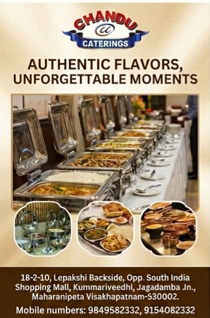 With over 15+ years of experience, Chandu Caterings brings the soul of celebration to Visakhapatnam. We serve authentic, hygienic, and delicious food tailored to your taste. From Grand Weddings to Birthday Parties, we ensure every dish delights your guests.